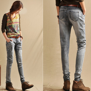 禾彩 冬裝新款繡花牛仔褲女長褲韓范 刺繡寬松哈倫褲顯瘦小腳褲子 /