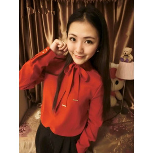 • 2305#春裝韓版長袖雪紡襯衣名媛氣質(zhì)綢帶蝴蝶結(jié) 修身雪紡襯衫 /