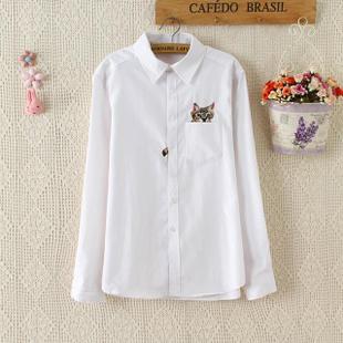 2015新款女裝森女系刺繡口袋貓翻領棉麻長袖女襯衫寬松襯衣批發(fā) /
