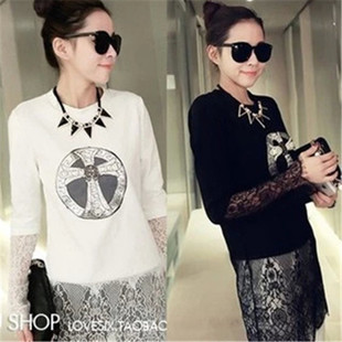 • 2015韓國(guó)蕾絲拼接下擺個(gè)性長(zhǎng)款T恤十字架圖案連衣裙 /
