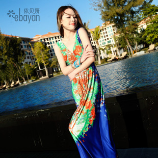 • 2015新款女裝 民族風連衣裙 雙V領印花冰絲沙灘裙 度假裙一件代發(fā) /