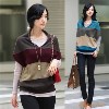 韓版秋冬新款 流行條紋拼接 百搭中長款蝙蝠袖V領(lǐng)女式毛衣批發(fā)455 /