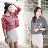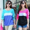 韓版秋季大碼女裝 圓領(lǐng)蝙蝠袖拼接撞色寬松長袖女式T恤 支持混批 /
