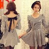 韓國(guó)性感千鳥格打底韓版女裝 春秋新款后背鏤空長(zhǎng)袖連衣裙 /