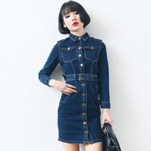 2015春夏新款歐美風(fēng)翻領(lǐng)單排扣襯衫長袖牛仔連衣裙外套女配腰帶 /
