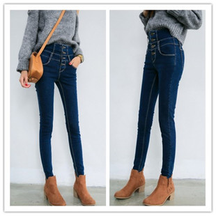 秋冬新款韓版女裝高腰排扣大碼顯瘦彈力加絨加厚牛仔褲 /