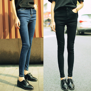 秋冬新款韓版女裝高腰修身顯瘦內(nèi)加絨牛仔褲女鉛筆小腳緊身長褲 /