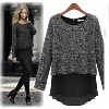 2014春裝歐美明星爆款圓領(lǐng)假兩件毛呢拼接加厚雪紡打底衫 針織衫 /