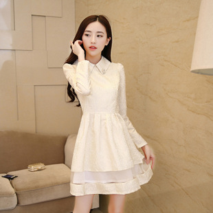 2015秋裝新款韓版歐根紗拼接娃娃領公主長袖裙蓬蓬連衣裙 /