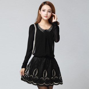 秋冬新款長(zhǎng)袖品牌連衣裙韓版大碼女裝釘珠領(lǐng)繡花網(wǎng)紗中腰百褶裙子 /