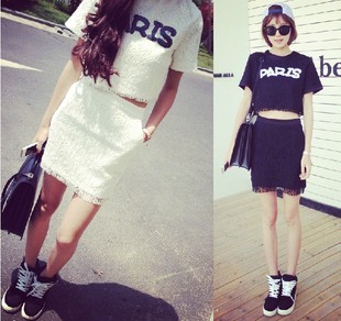 夏季新款女裝韓版字母蕾絲短袖上衣T恤女修身半身裙短裙兩件套裝 /