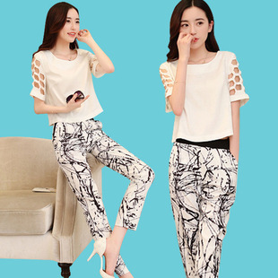 誠(chéng)招女裝品牌代理 2015女裝鏤空袖上衣潑墨印花小腳褲休閑套裝 /