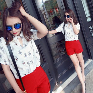 【實拍】新款女裝短袖動物顯瘦雪紡衫襯衫修身短褲套裝 /