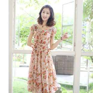 2015夏裝新款 經(jīng)典氣質(zhì)修身顯瘦中長款短袖印花連衣裙 /