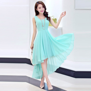 2015夏新品女士雪紡連衣裙夏 韓版修身燕尾不規(guī)則百褶 背心長裙 /