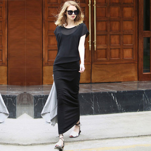 歐洲站2015夏季新款女式雪紡連衣裙修身顯瘦優(yōu)雅氣質(zhì)短袖長裙 /
