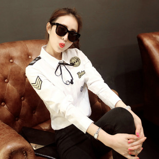 歐洲站2015春裝新款韓版軍裝風時尚女士襯衣 徽章貼布棉襯衫女裝 /
