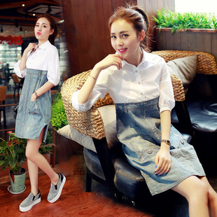 春裝新款2015時尚女裝襯衫裙女韓版修身款短袖拼接牛仔裙子連衣裙 /