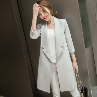 歐洲站新款2015中長款七分袖風衣外套韓版時尚棉麻西裝女外套 /