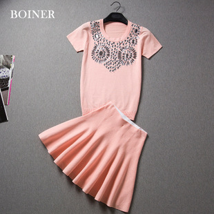 歐洲站2015春夏新品女裝休閑針織鑲鉆百褶短裙兩件套女式套裝批發(fā) /