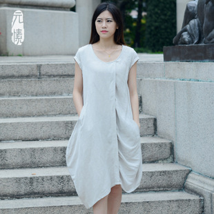 元愫 夏季原創(chuàng)設(shè)計棉麻文藝女裝不規(guī)則短袖亞麻連衣裙 大碼女裝 /