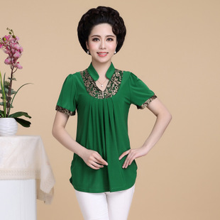 新款中年女裝短袖T恤 寬松大碼中老年媽媽裝夏裝短袖V領(lǐng)上衣批發(fā) /