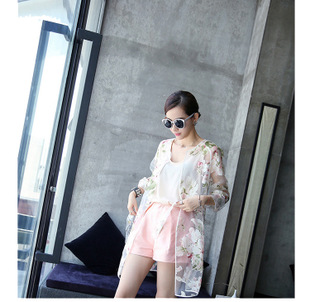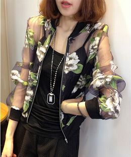 2015夏新款女裝歐根紗水墨印花防曬衣棒球服衫短外套薄款防曬衫 /