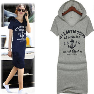 2015夏季短袖歐美連帽連衣裙大碼顯瘦修身 新款棉印花中長款女 /