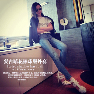 【伊思沛】2015復(fù)古暗花 棒球外套 女棒球服 黑白色小外套 休閑 /