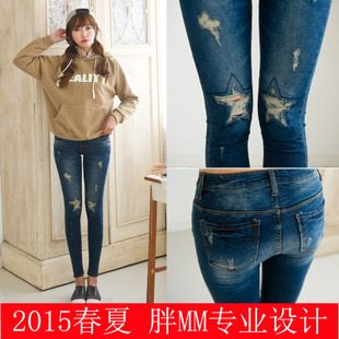 2015春夏新款韓版大碼胖MM修腿破洞牛仔褲女速賣通EABY外貿(mào)批發(fā) /