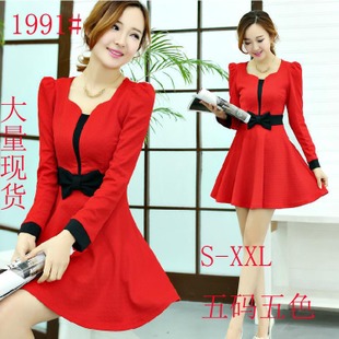 2014新款秋季甜美蝴蝶結(jié)鄰家女孩長袖修身紅色連衣裙女中長款 /