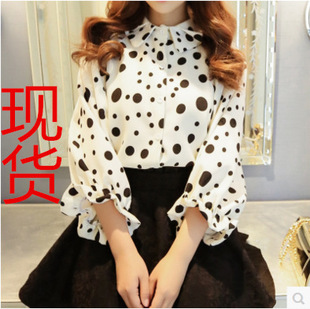 2015新款夏裝女裝黑白波點(diǎn)雪紡衫七分袖中長款白搭女式襯衫 /
