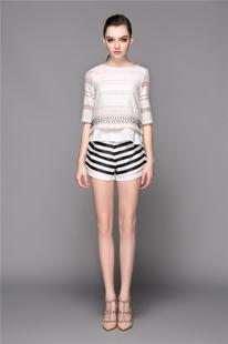 歐美春夏兩件套女裝時(shí)尚條紋釘珠中袖上衣+短褲休閑套裝 /