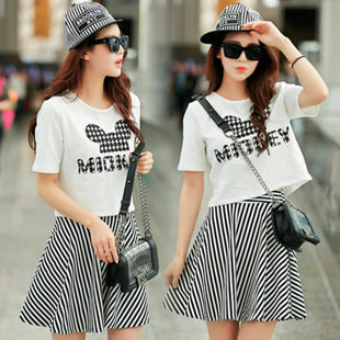 米老鼠Mickey圖案純棉短款T+條紋半身傘裙2015夏新款套裝 /