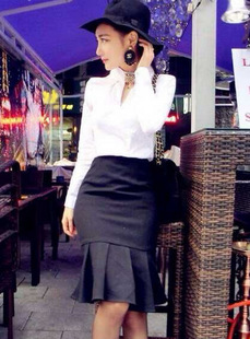 2015早春新款性感鏤空深V半高領(lǐng)上衣+高腰魚尾裙兩件套套裝 /