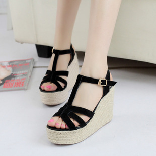 夏季草編沙灘女鞋真皮羅馬松糕坡跟涼鞋厚底高跟 555-21 /