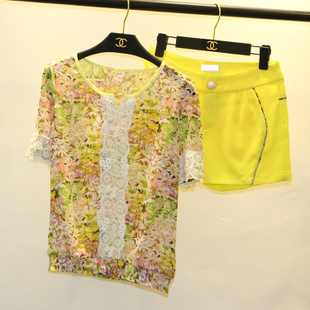 韓國 蕾絲衫+黃色短褲 時尚碎花兩件套裝 /