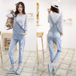 2015春季新款中腰牛仔背帶長褲女 學(xué)院風(fēng)水洗磨破寬松吊帶牛仔褲 /