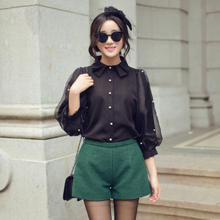 廠家特價(jià)供應(yīng)2015春季新款歐根紗釘珍珠泡泡袖七分袖女襯衣 上衣 /