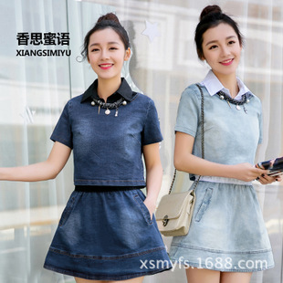 歐洲站2015春裝新款兩件套顯瘦女裝牛仔連衣裙A字裙短裙子夏季潮 /