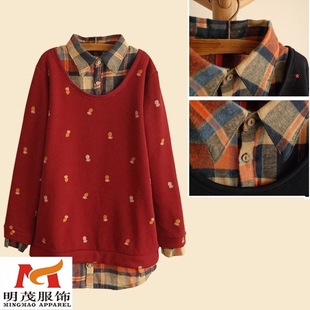 2015韓版胖MM新款假兩件 大碼女裝長(zhǎng)袖薄款格子 /