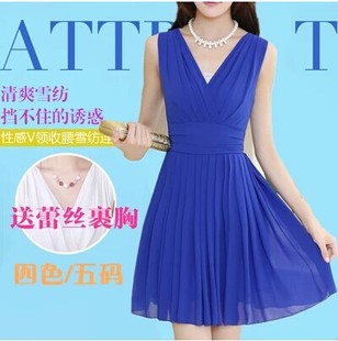 夏季新款大碼韓版修身氣質(zhì)禮服無袖A字性感V領(lǐng)雪紡連衣裙 /