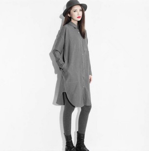 2015春款獨(dú)家定制 爽滑垂墜 BF風(fēng)帥氣寬松豎條紋開叉襯衫裙 /