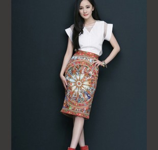 2015楊冪同款氣質(zhì)顯瘦V領(lǐng)襯衫+復(fù)古印花包臀半裙兩件裙套裝 /