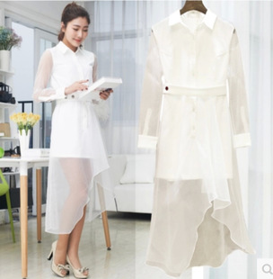 優(yōu)質(zhì)版2015春裝新款韓版長袖歐根紗連衣裙女修身假兩件收腰長裙子 /