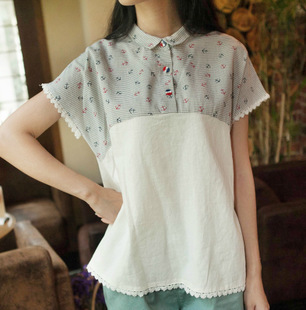 2015夏季新款森女日系學院風印花船錨條紋棉麻寬松上衣短袖女t恤 /