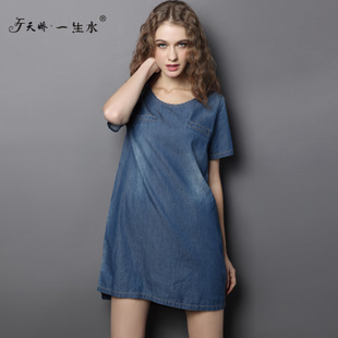 天嬌一生水2014夏裝新款韓版大碼女裝短袖胖mm修身顯瘦牛仔連衣裙 /