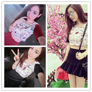 2015夏新款韓版短款露臍印花拼色上衣搭配荷葉魚尾短裙時尚套裝 /