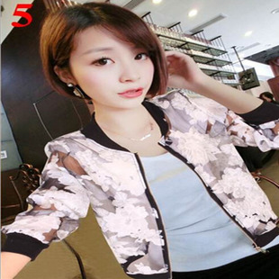 2015春裝外套女短款甜美修身夾克網(wǎng)紗印花防曬衣潮夏季歐根紗上衣 /