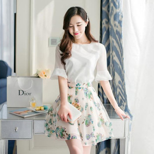 2015春裝新款女韓版兩件套印花雪紡連衣裙 半裙加上衣 廠價(jià)直銷 /